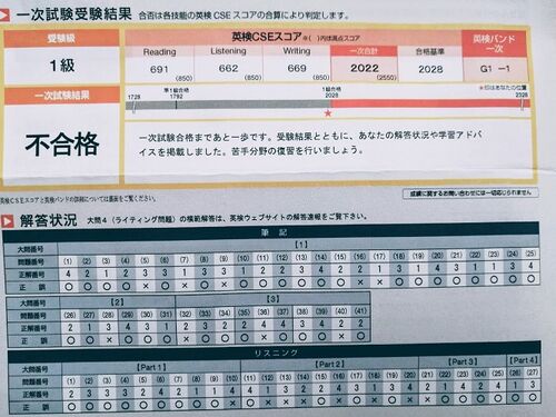先日の英検1級の成績表が届きました! ぐちぐちとしたネガティブな感情は前回すべて吐き出してスッキリしたので 今回は冷静に前向きに成績表を確認して今後の取り組むことを分析したいと思います。 まずはグサグサと受験者にダメージを与えに来る不合格の文…